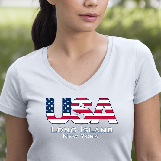 USA What's Up Long Island? Ladies' V-Neck T-Shirt | Patriotic Top, Summer Wear, Travel Tee, Gift for Her, Independence Day