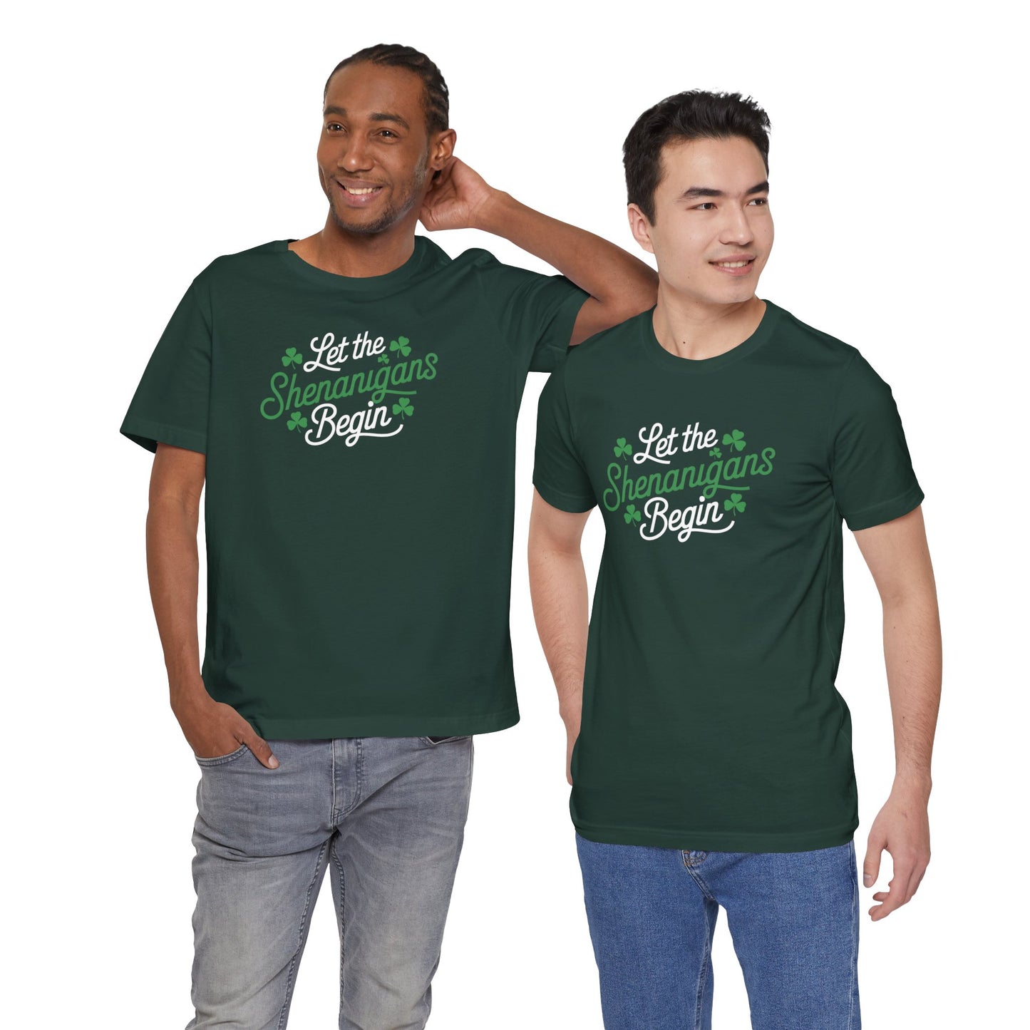 A fun and lighthearted T-Shirt featuring the words "Let the Shenanigans Begin" with a few shamrocks, perfect for St. Patrick's Day celebrations and anyone who enjoys a playful vibe in their wardrobe. Made with 100% Airlume combed and ring-spun cotton, this T-Shirt is lightweight and breathable, suitable for active and leisure wear. The retail fit and crew neckline make it versatile for casual and semi-formal settings.