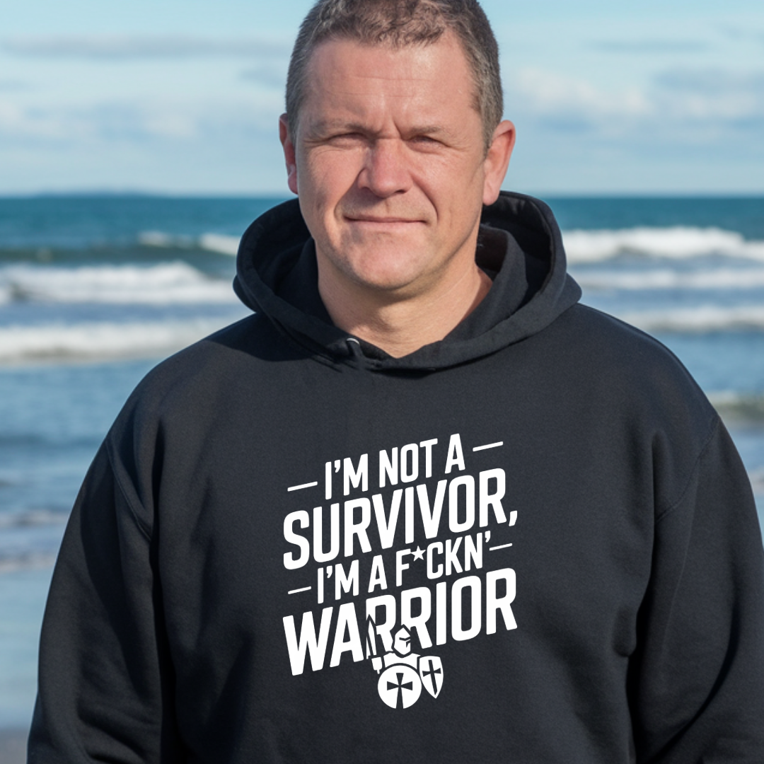 Embrace your strength and courage with this powerful "I'm Not a Survivor, I'm a F*ckn Warrior" sweatshirt, available in a variety of vibrant colors. Featuring bold white lettering on the front and a striking warrior graphic holding a shield and sword, this hoodie symbolizes resilience and the unbreakable spirit of a true fighter.
