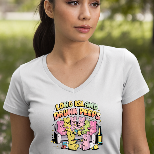 What's Up Long Island? Drunk Peeps Ladies' V-Neck T-Shirt - Fun Spring/Summer Graphic Tee - Easter