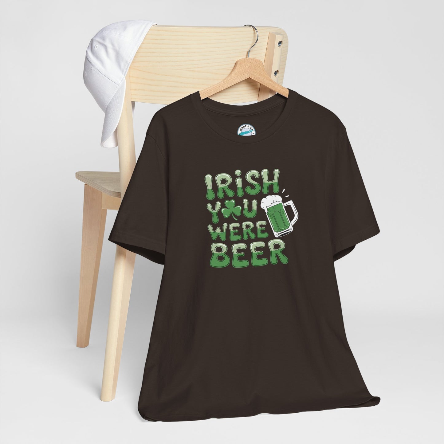Celebrate St. Patrick's Day in style with this fun and festive T-Shirt featuring a graphic that says 'Irish You Were Beer' with a mug filled with beer. Perfect for those who love to add a touch of humor and whimsy to their wardrobe. Ideal for St. Patrick's Day celebrations and pub crawls.