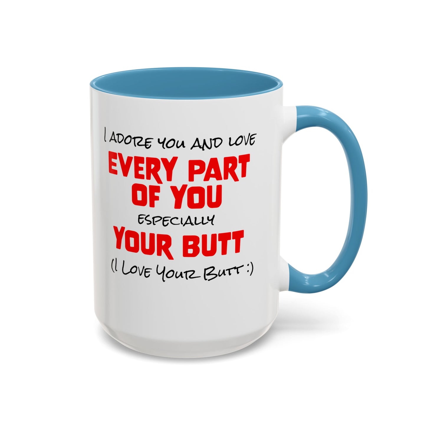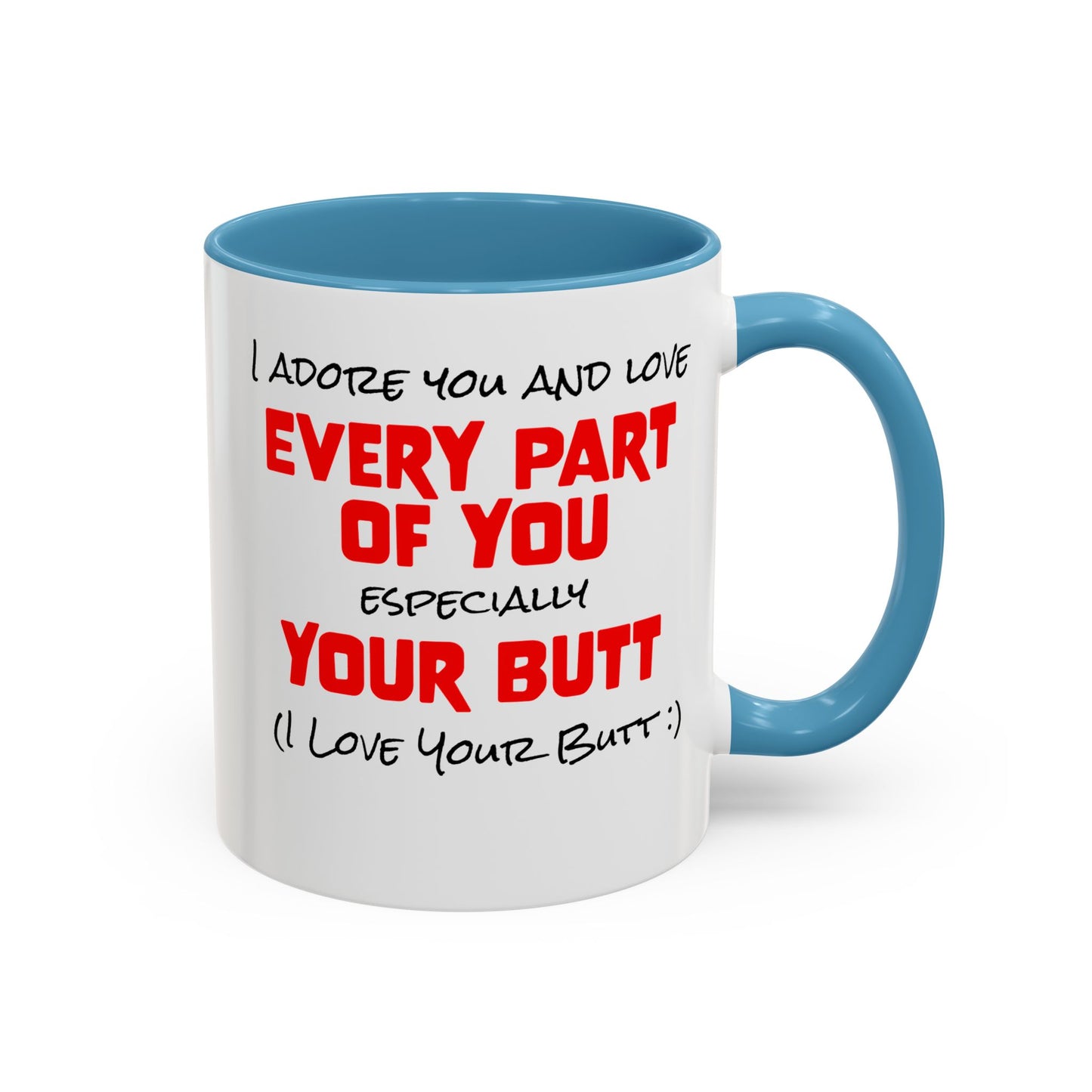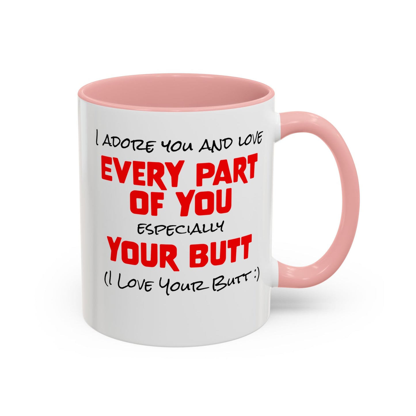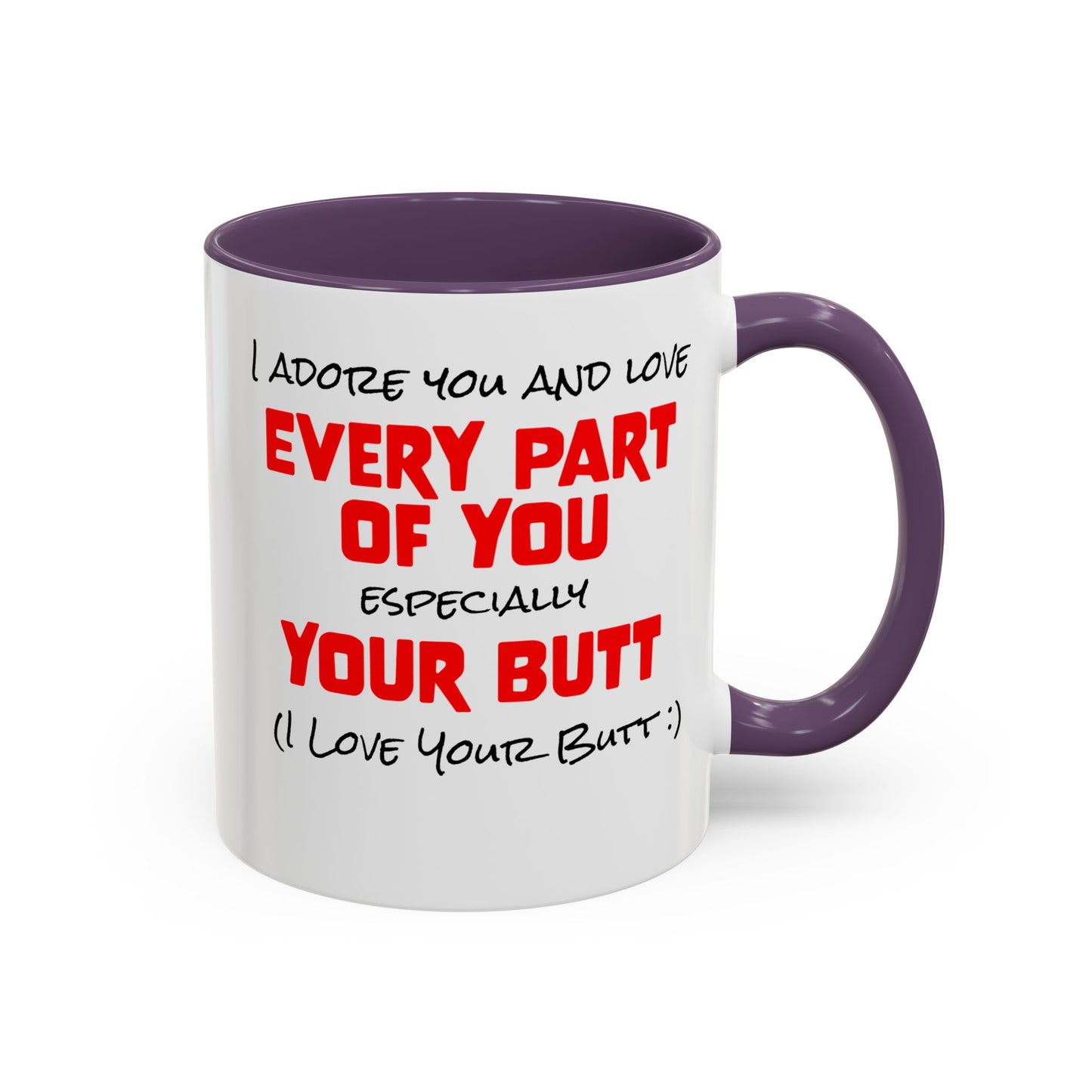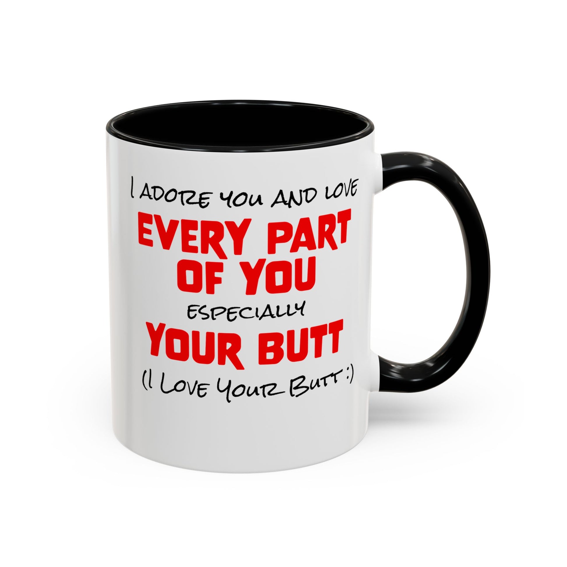 Start your day with a little love and laughter with this playful two-tone mug! Featuring the sweet and cheeky message "I Adore You And Love Every Part of You, Especially Your Butt", this mug is perfect for adding a touch of humor to your coffee or tea routine.