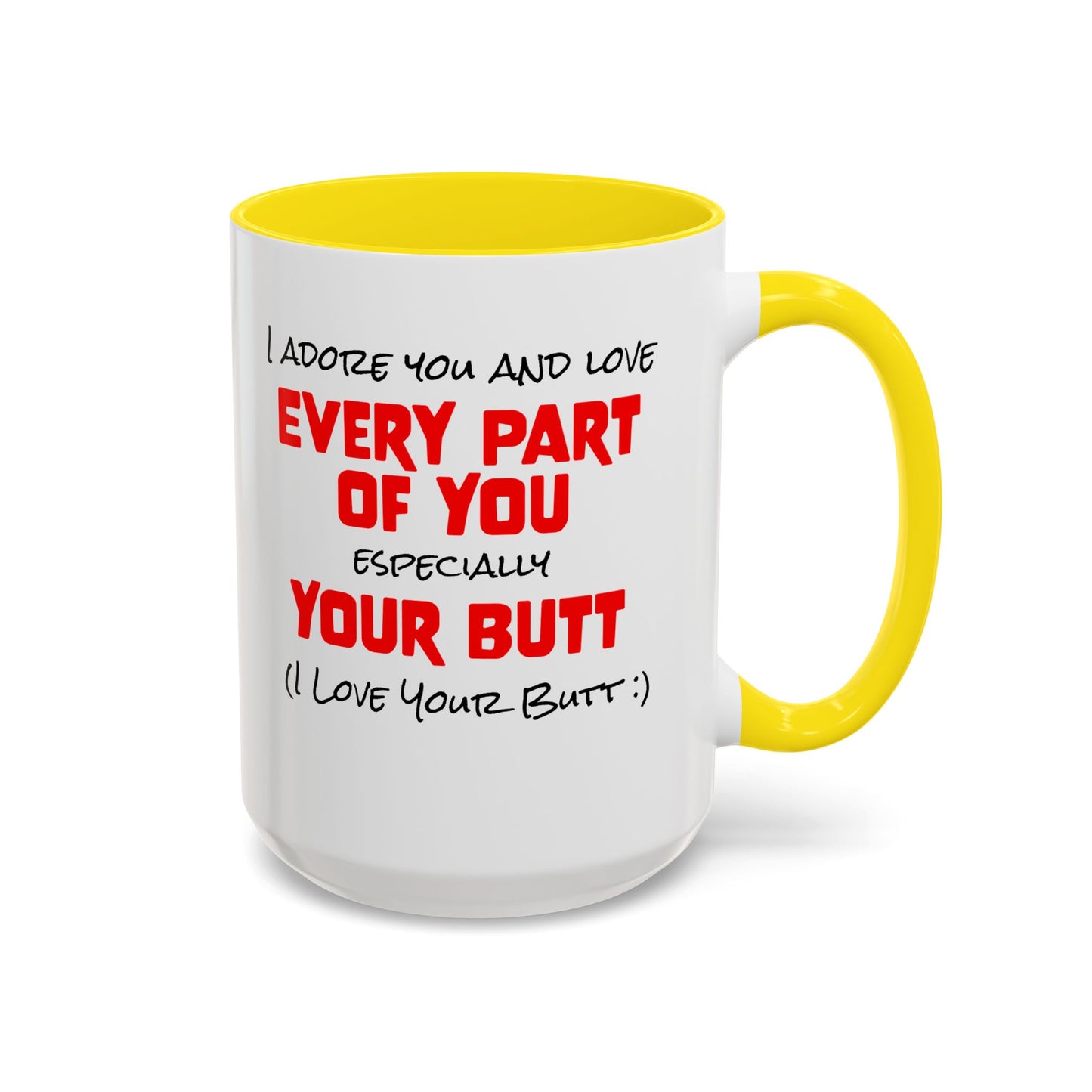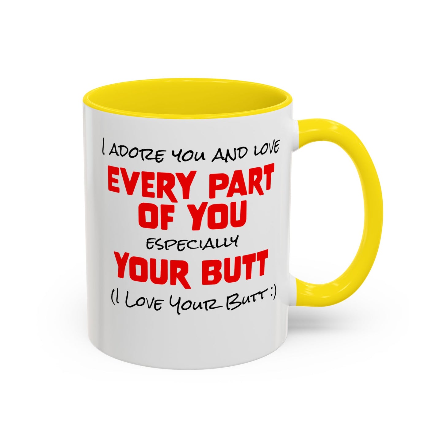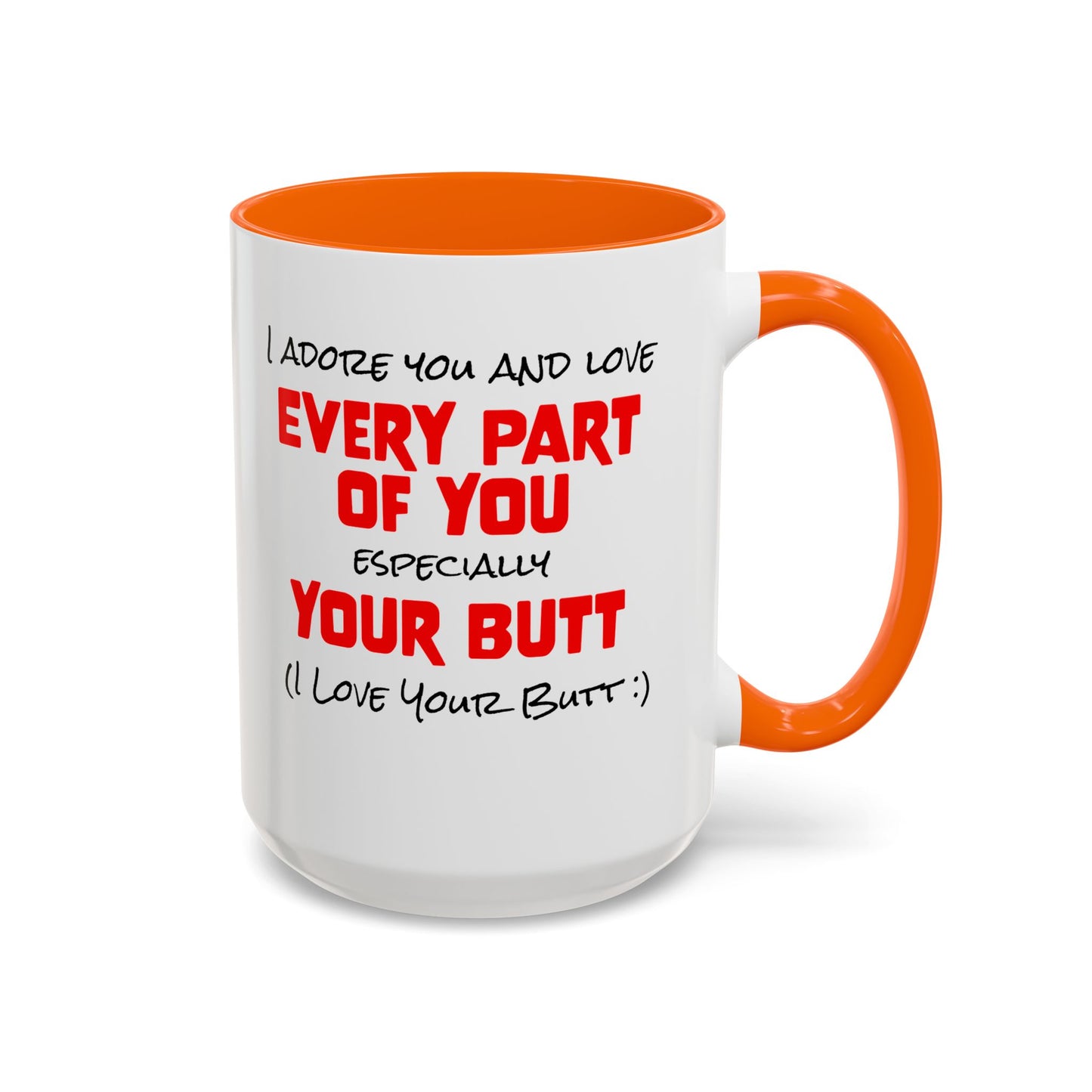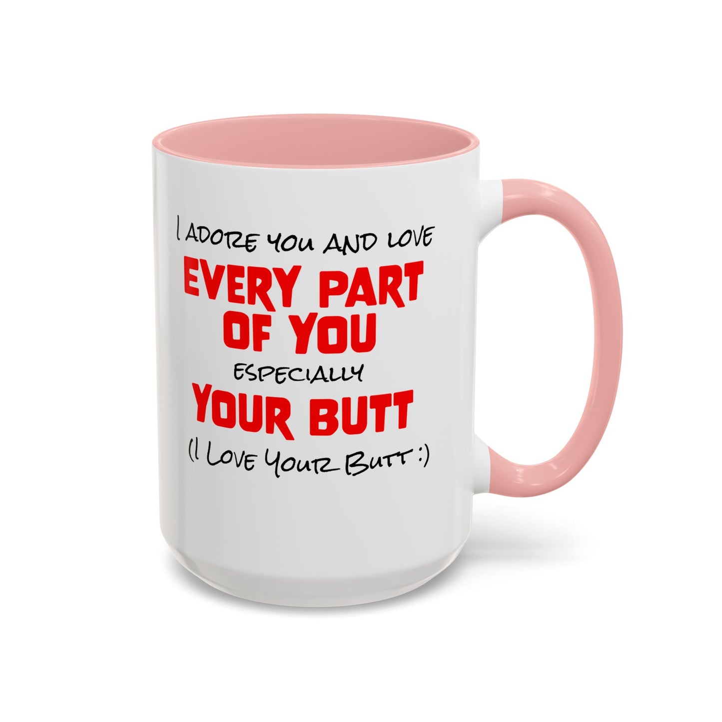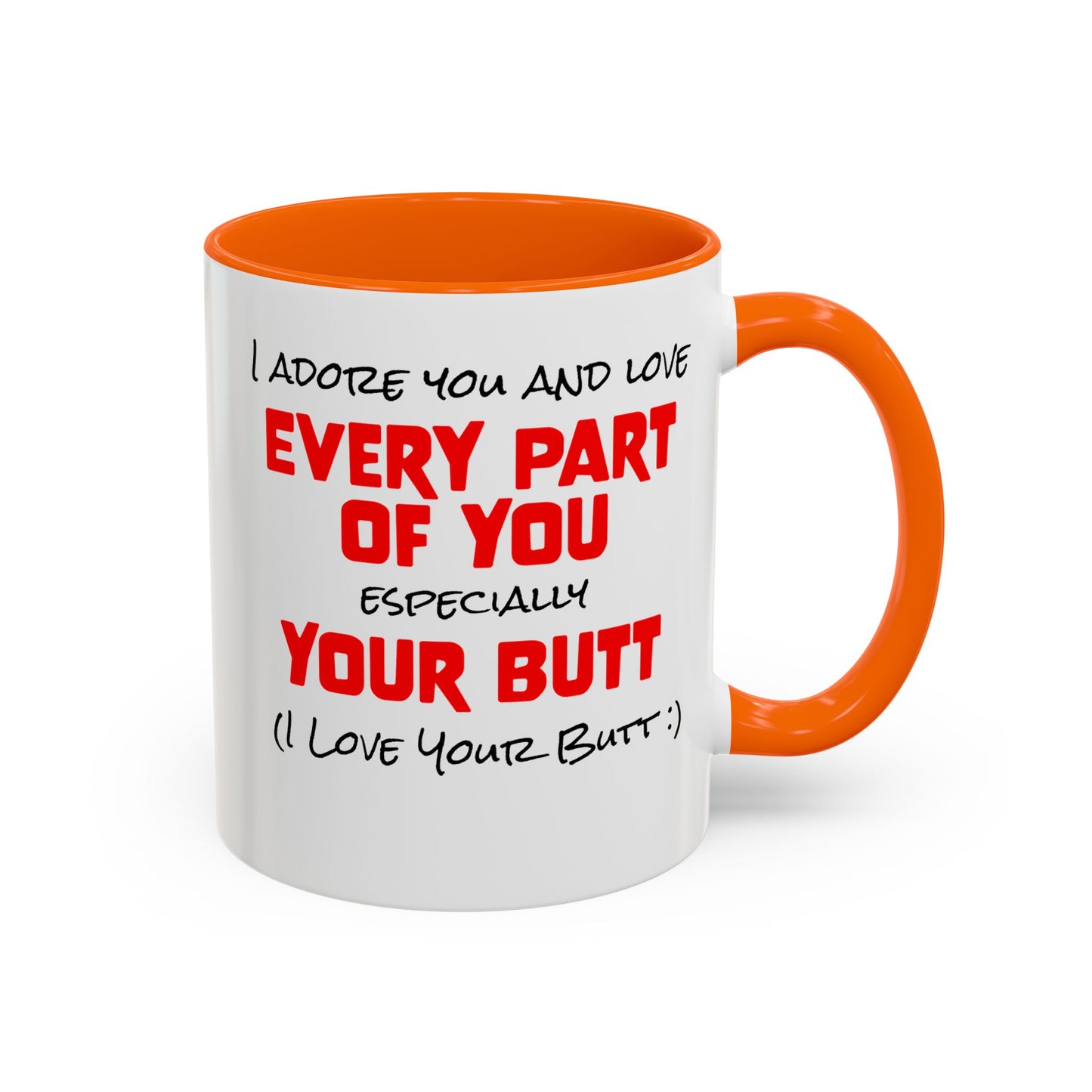 Start your day with a little love and laughter with this playful two-tone mug! Featuring the sweet and cheeky message "I Adore You And Love Every Part of You, Especially Your Butt", this mug is perfect for adding a touch of humor to your coffee or tea routine.