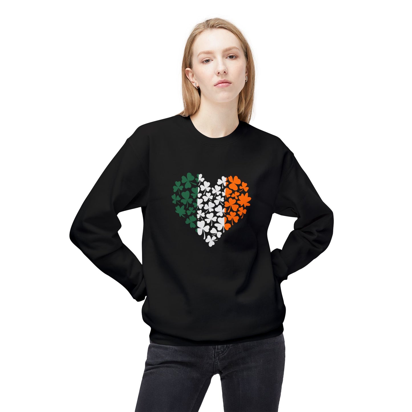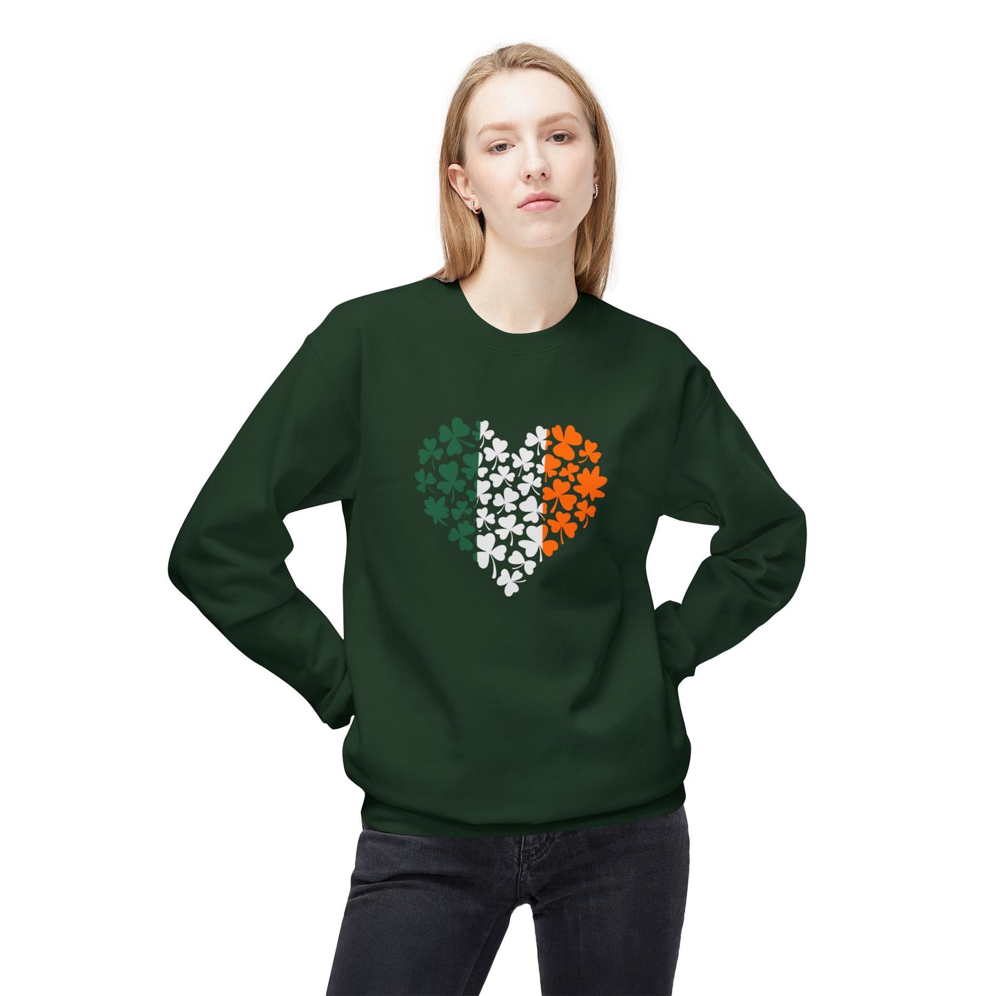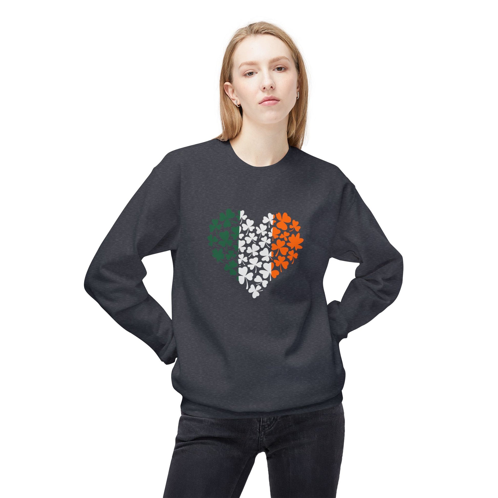 Embrace warmth and style with this Unisex Midweight Softstyle Fleece Crewneck Sweatshirt. Perfect for cool days, this sweatshirt features a unique heart design filled with vibrant shamrocks in green, white, and orange, celebrating Irish heritage and culture. Whether you're gathering with friends, attending a parade, or simply enjoying a cozy night at home, this sweatshirt is an ideal addition to your wardrobe. Its relaxed fit and soft fabric provide all-day comfort, making it perfect for those who appreciate casual yet stylish attire. Great for St. Patrick's Day celebrations, family gatherings, or just showing off your love for Ireland, this sweatshirt is a versatile choice for anyone who values comfort and style. Celebrate your heritage or gift it to a friend; this sweatshirt speaks to the heart of Irish pride.