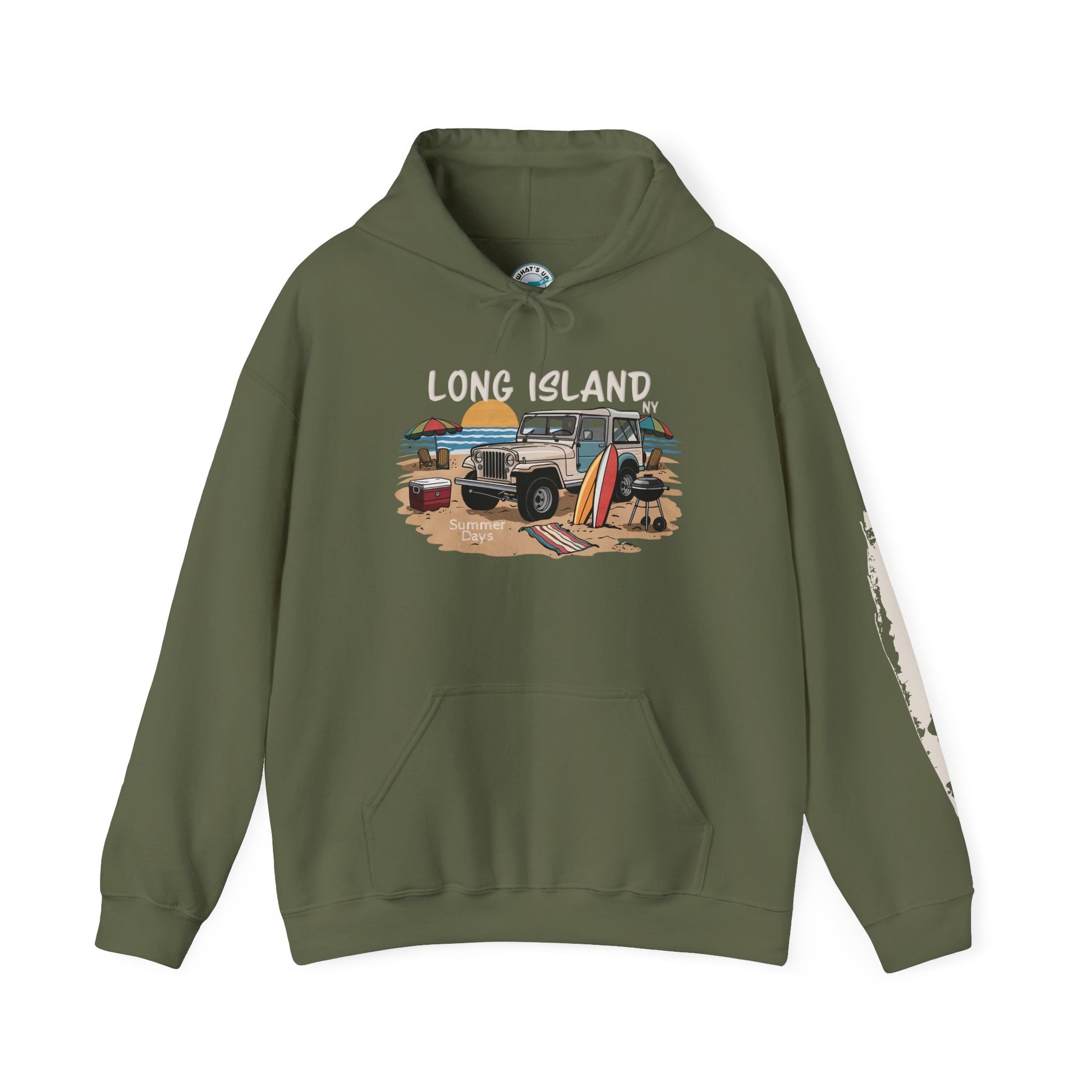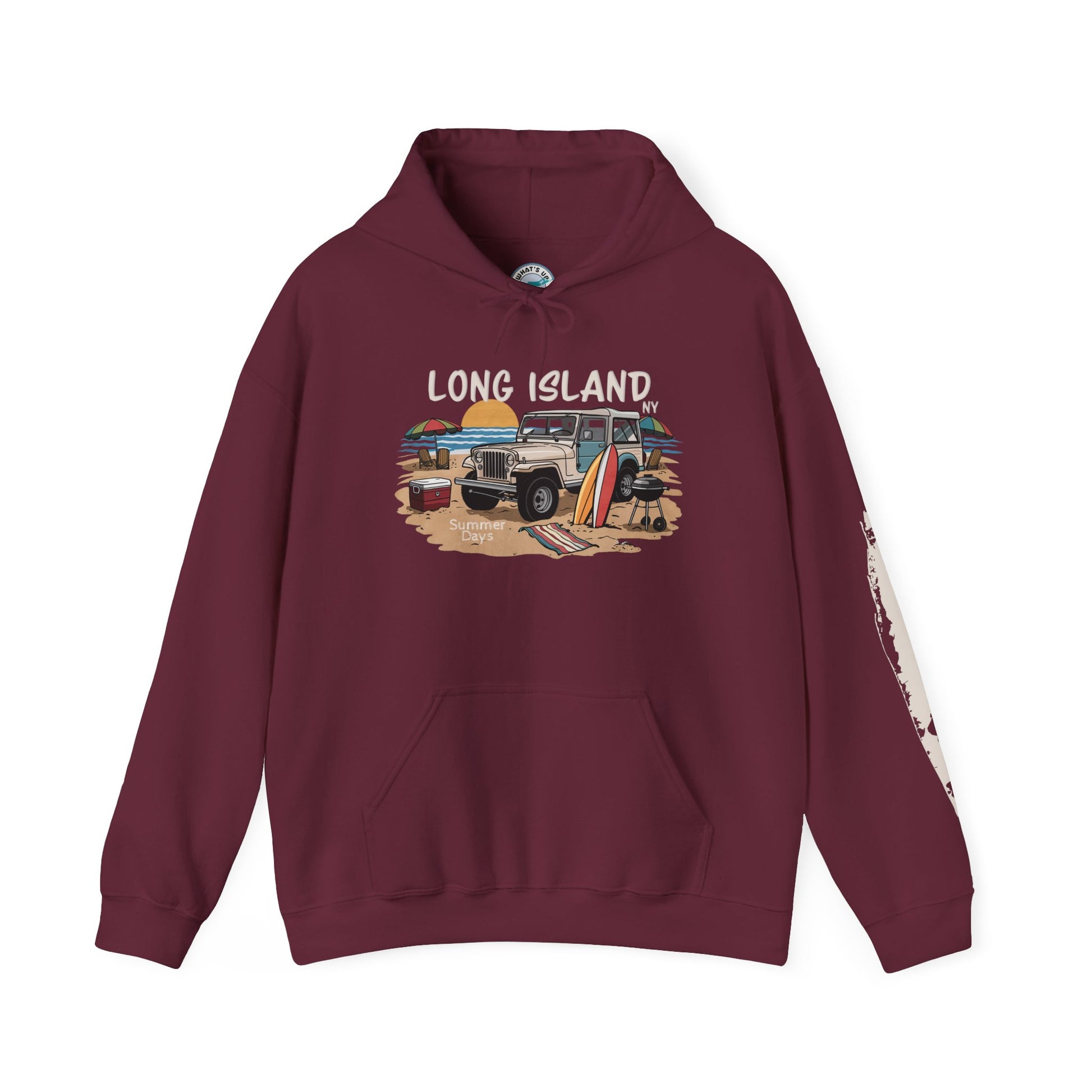 Stay warm and cozy with this Unisex Heavy Blend™ Hooded Sweatshirt featuring a Long Island graphic on the beach with a jeep, cooler, BBQ, and surfboards. Perfect for those who love the beach lifestyle and outdoor adventures. Ideal for casual wear, beach parties, bonfires, and family barbecues.
