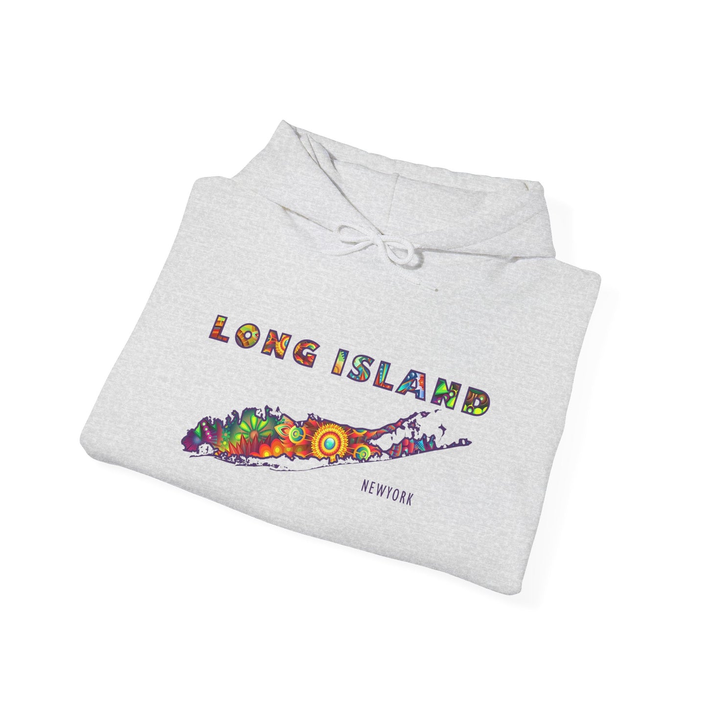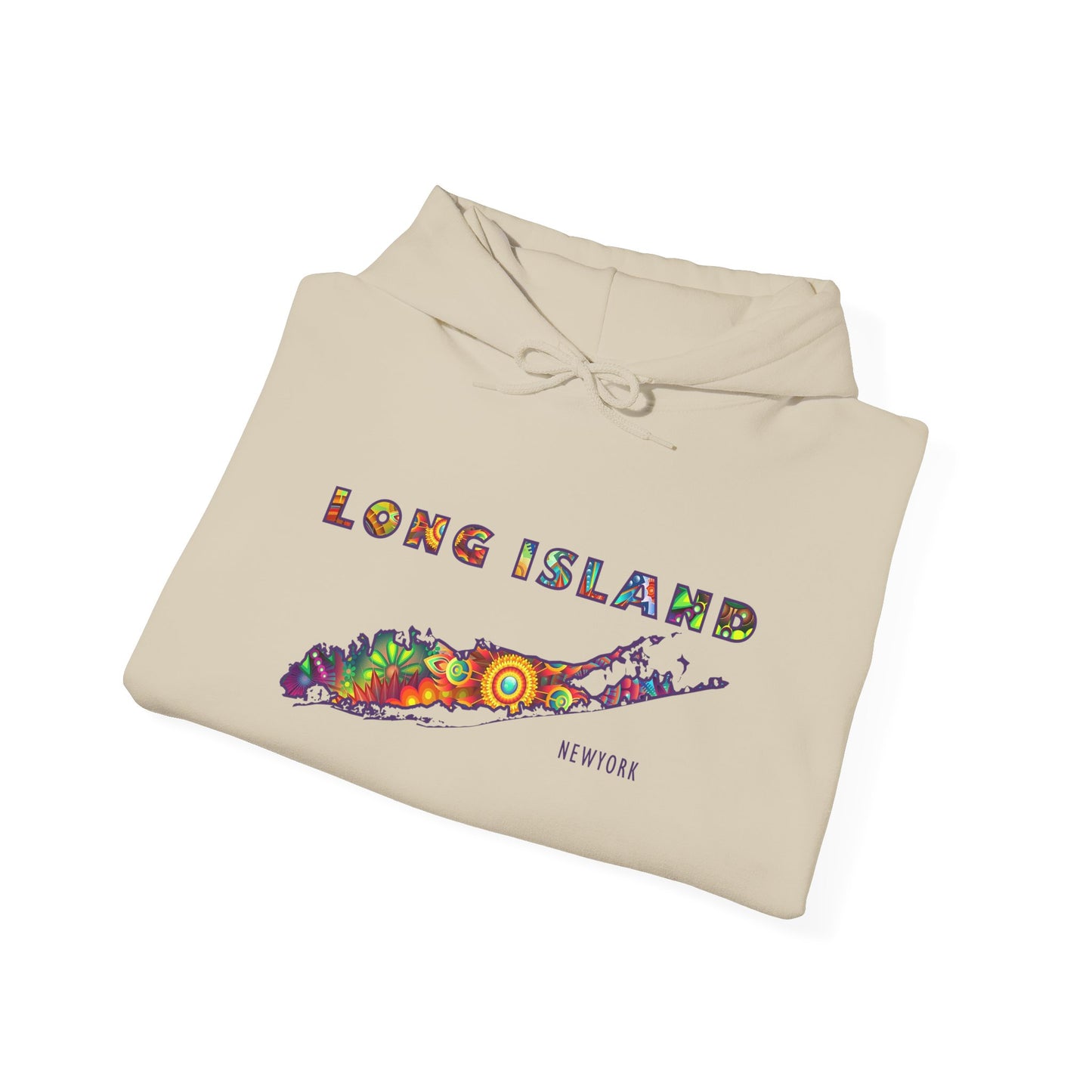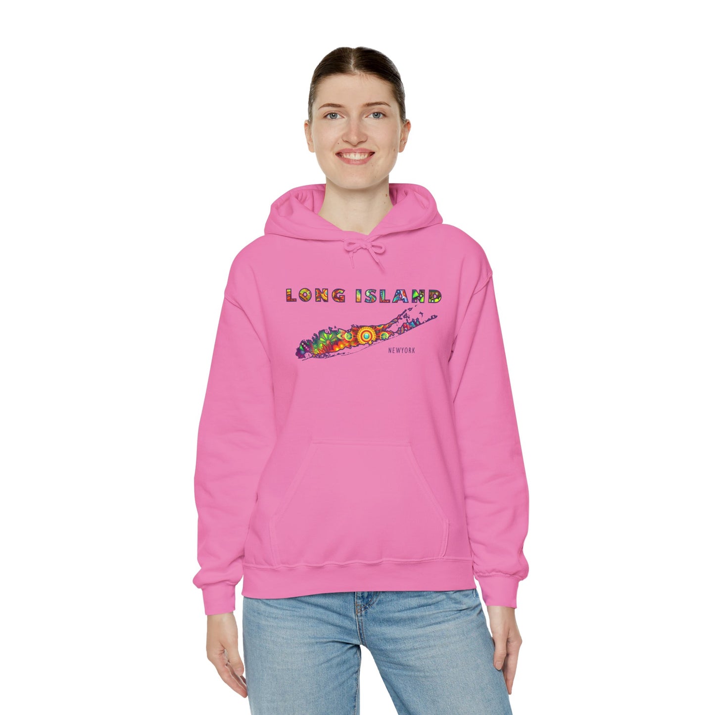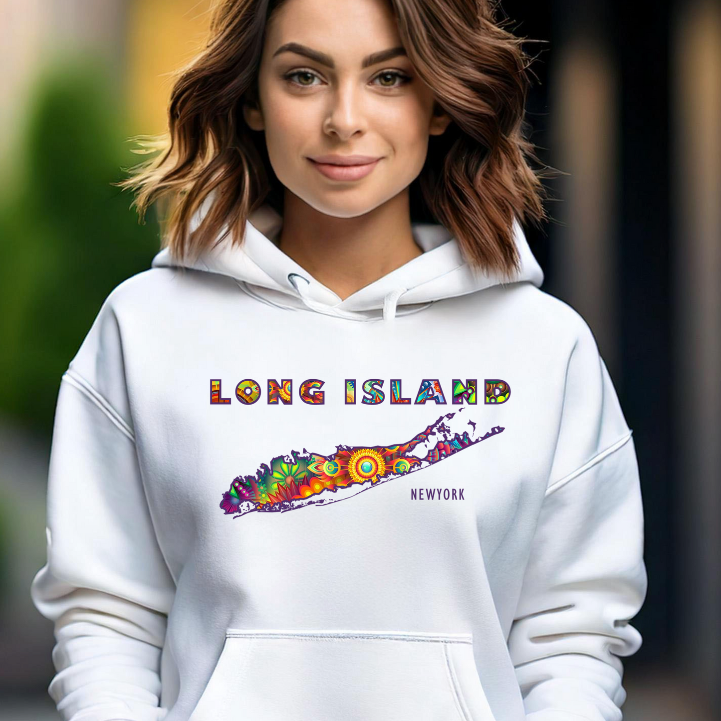 Long Island Colorful Bohemian Feel Map Unisex Hoodie - Perfect for Beach Lovers & Gift for New Yorkers