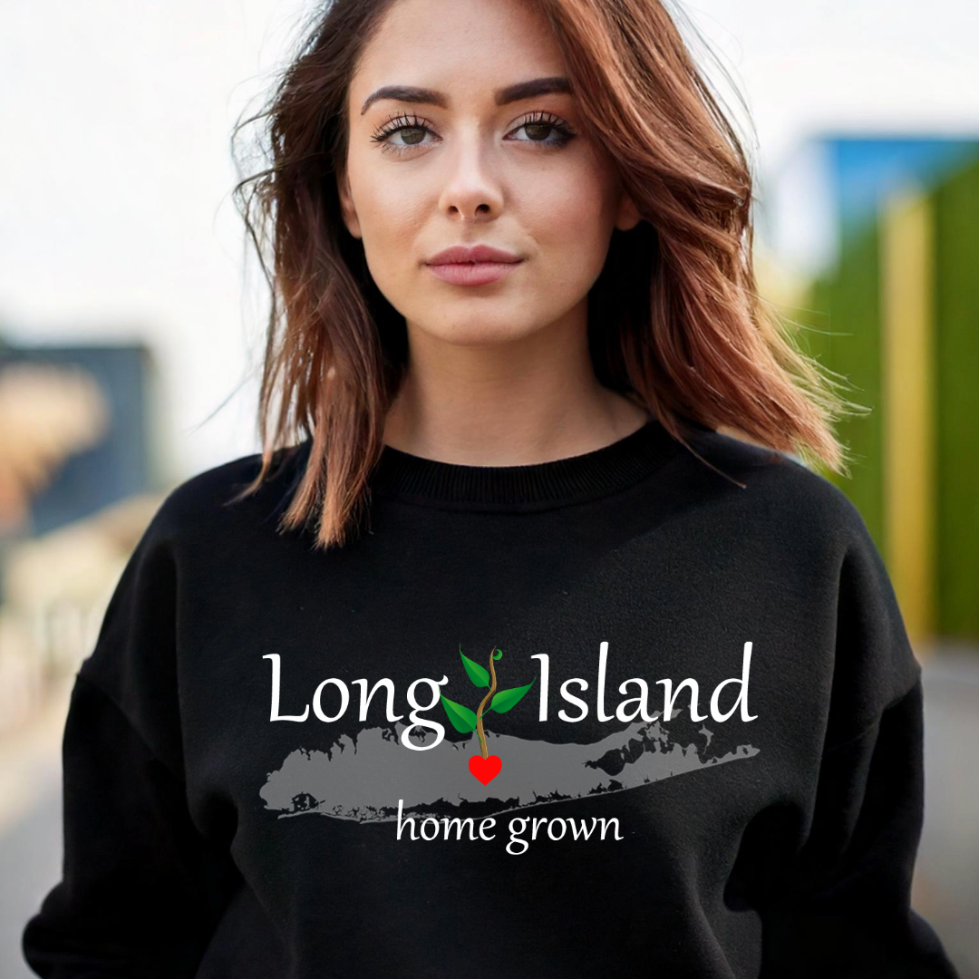 Wrap yourself in hometown pride with our "Long Island, Home Grown" sweatshirt! Featuring the phrase boldly across the chest, this cozy sweatshirt showcases a stylized map of Long Island with a heart at its center, from which a delicate plant grows—symbolizing deep roots, local love, and the island’s natural beauty.