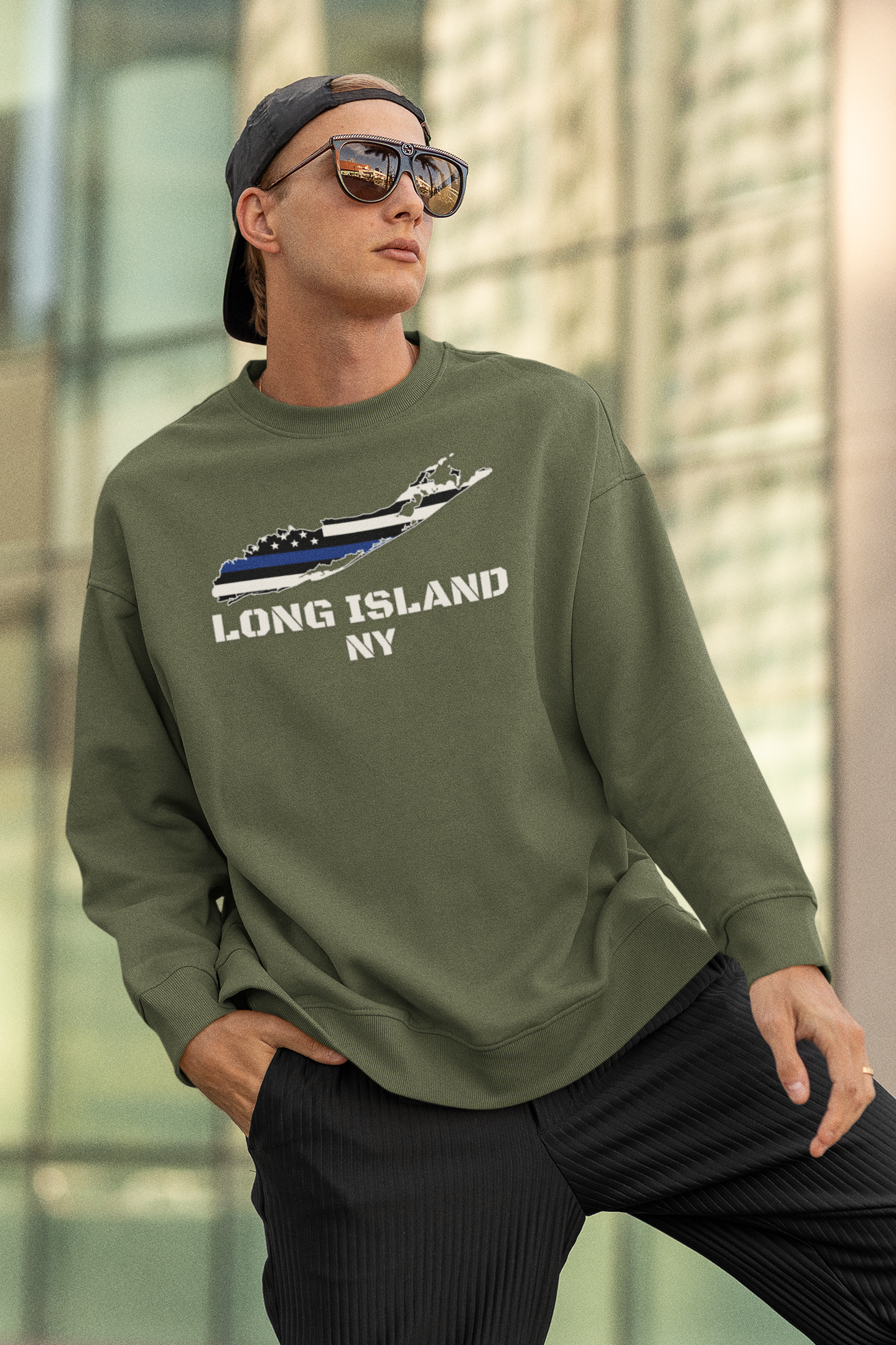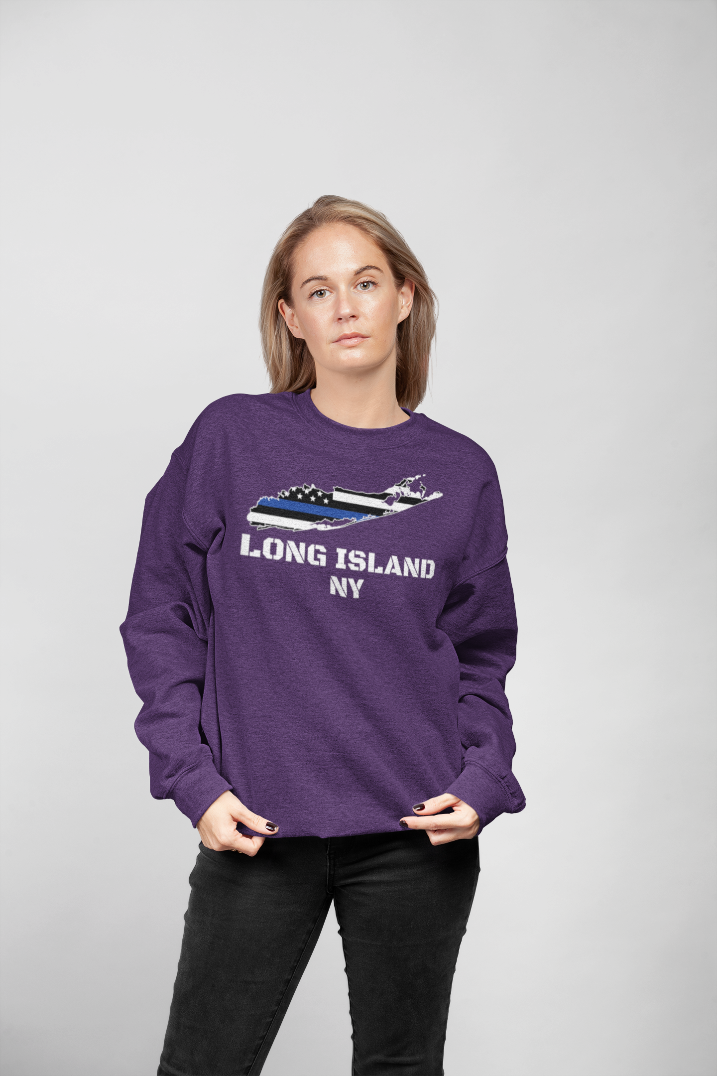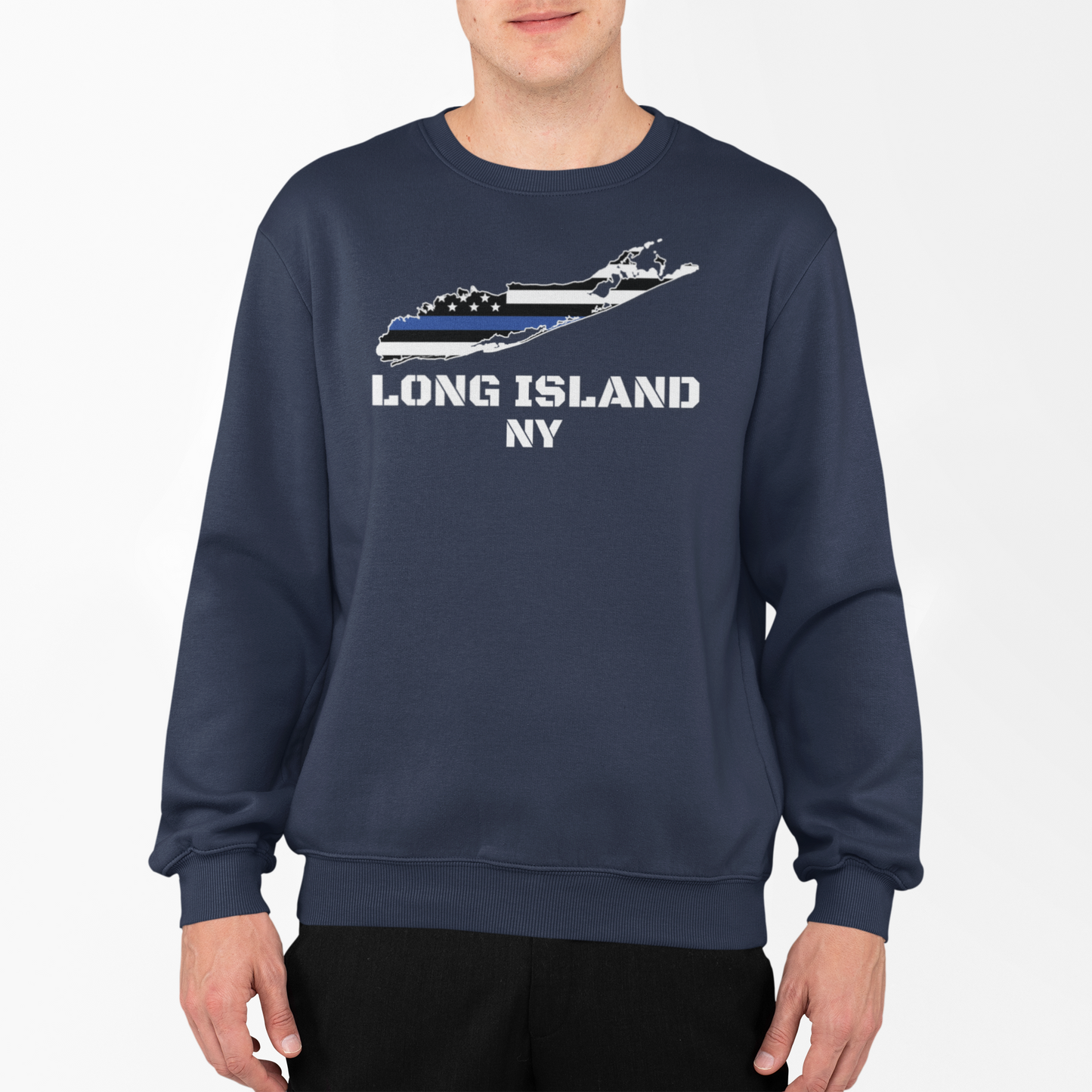 Show your Long Island pride and support for law enforcement with this premium unisex sweatshirt, featuring the bold phrase "Long Island, New York" alongside a detailed graphic of Long Island. Within the island’s shape, the design proudly displays the USA police color flag, symbolizing honor, respect, and support for the men and women in blue who serve and protect our communities..