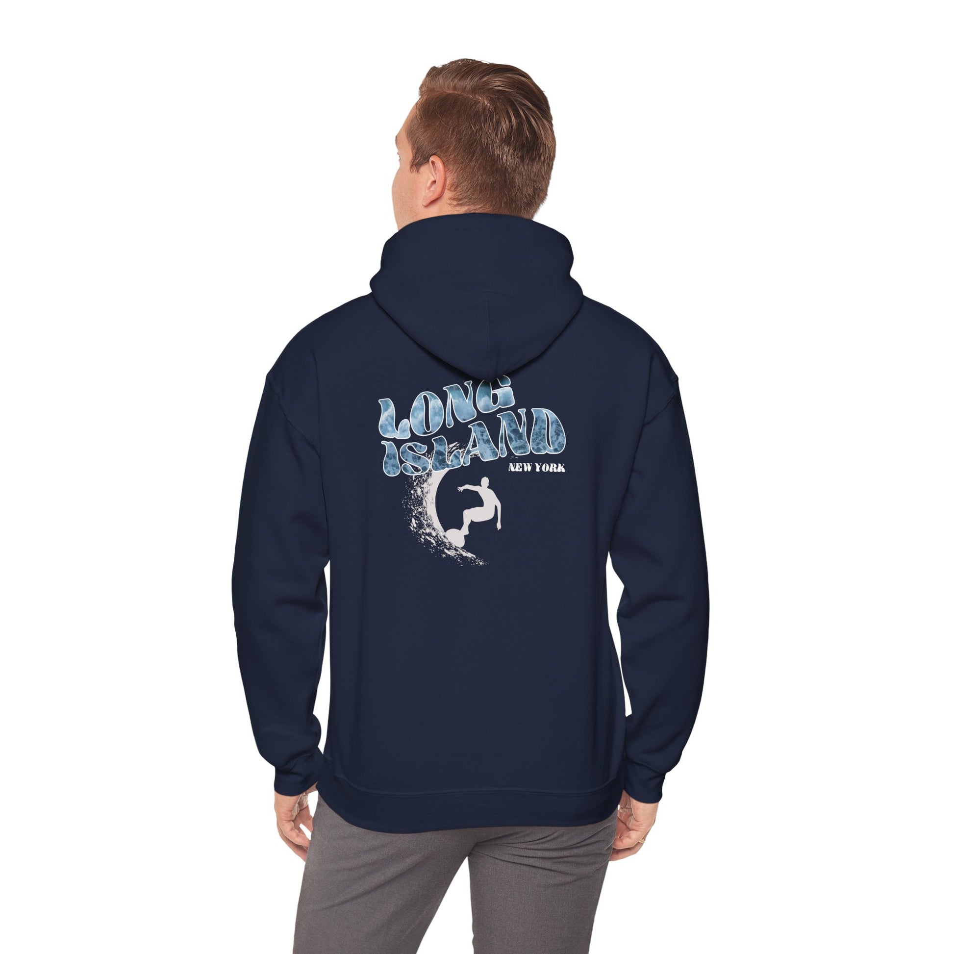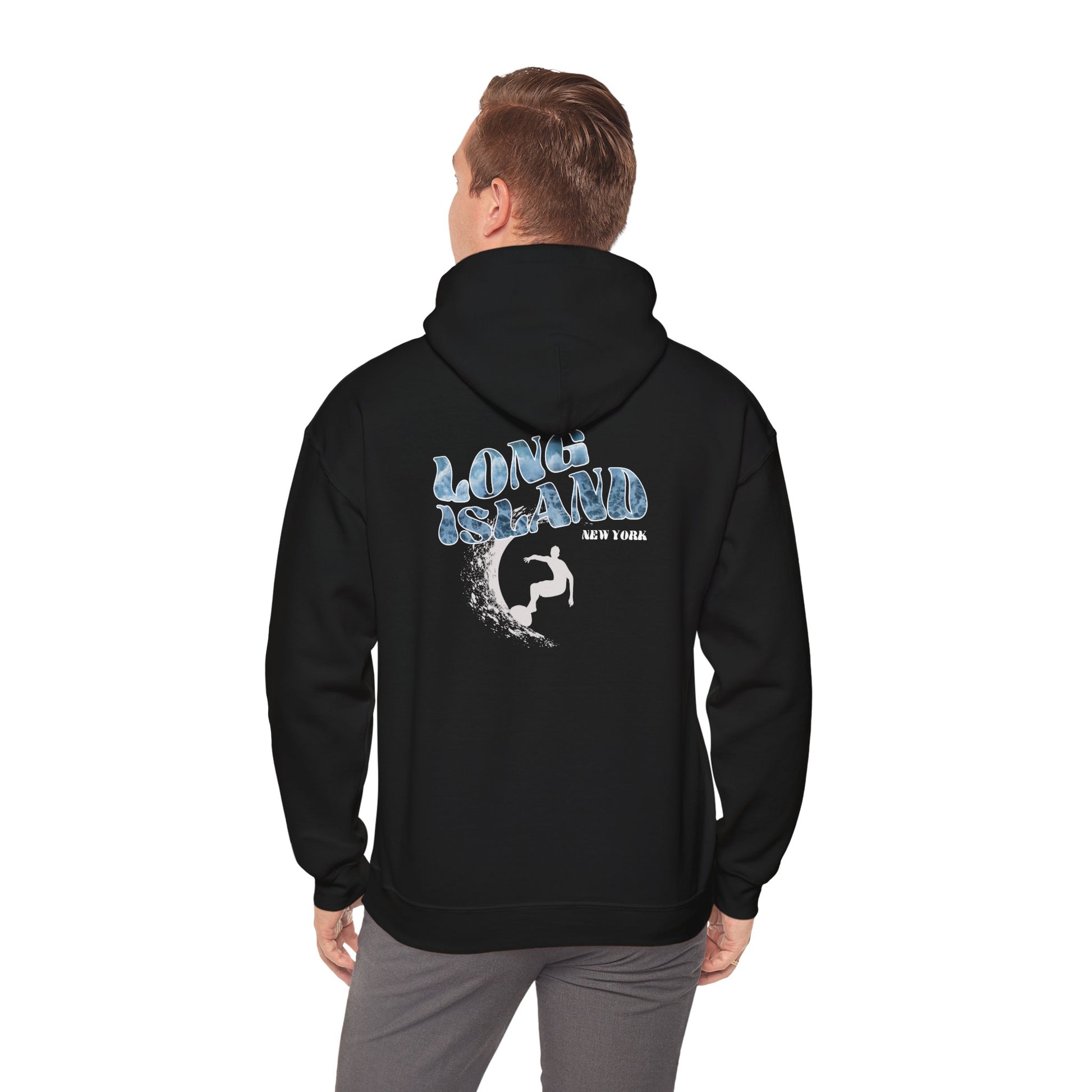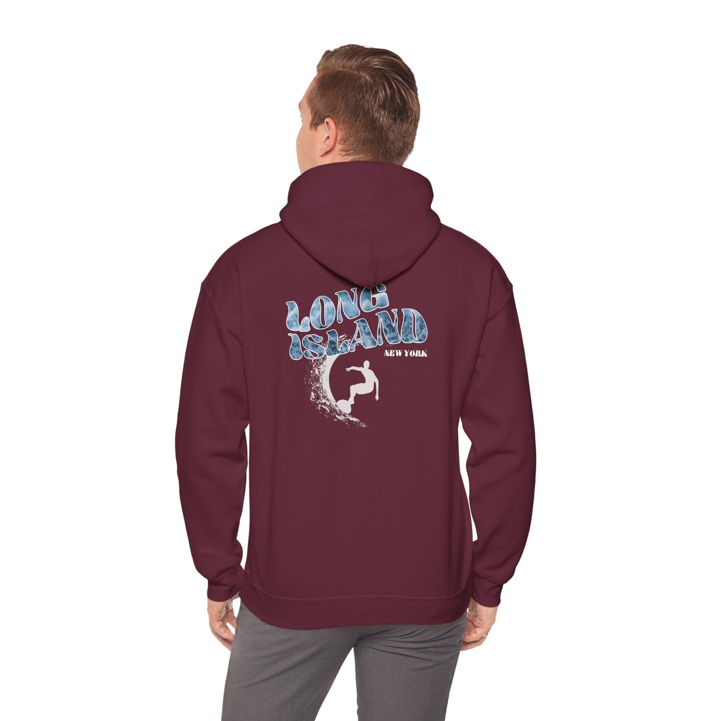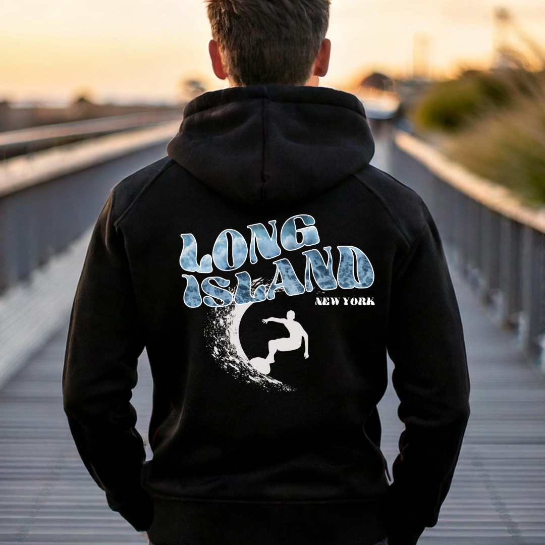 Ride the wave in style with our Long Island Surf Hoodie! This unique hoodie features a bold silhouette of a surfer catching a wave, perfectly capturing the energy and thrill of Long Island’s surf culture. Above the scene, "Long Island" is written in a curved font, creatively filled with a wave pattern that brings a splash of the ocean to the design. Made from a cozy, durable cotton blend, this hoodie is ideal for cool beach nights, morning surf sessions, or casual outings. It’s the perfect way to keep warm while showing off your love for Long Island’s iconic surf scene!
