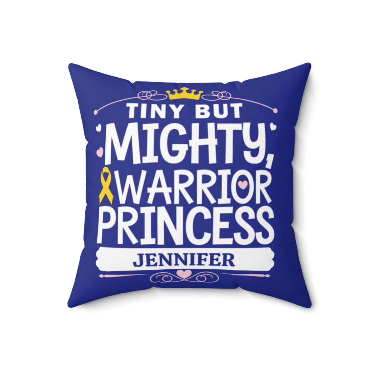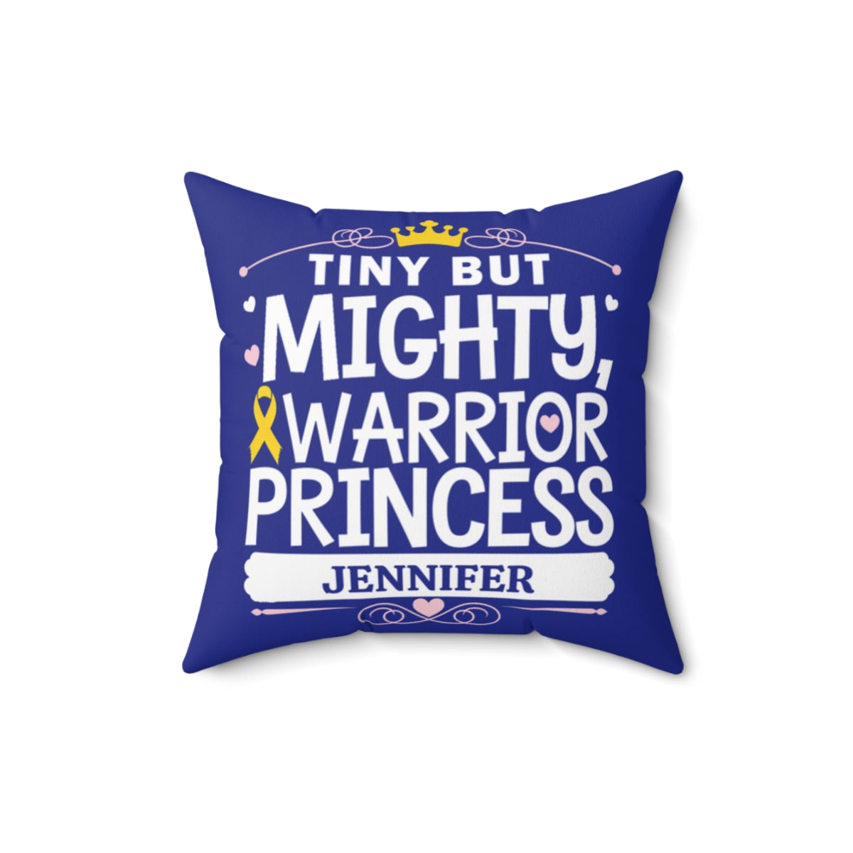Personalized [ANY NAME] Tiny But Mighty Warrior Princess Blue Pillow - Gold ribbon is international awareness symbol for childhood cancer