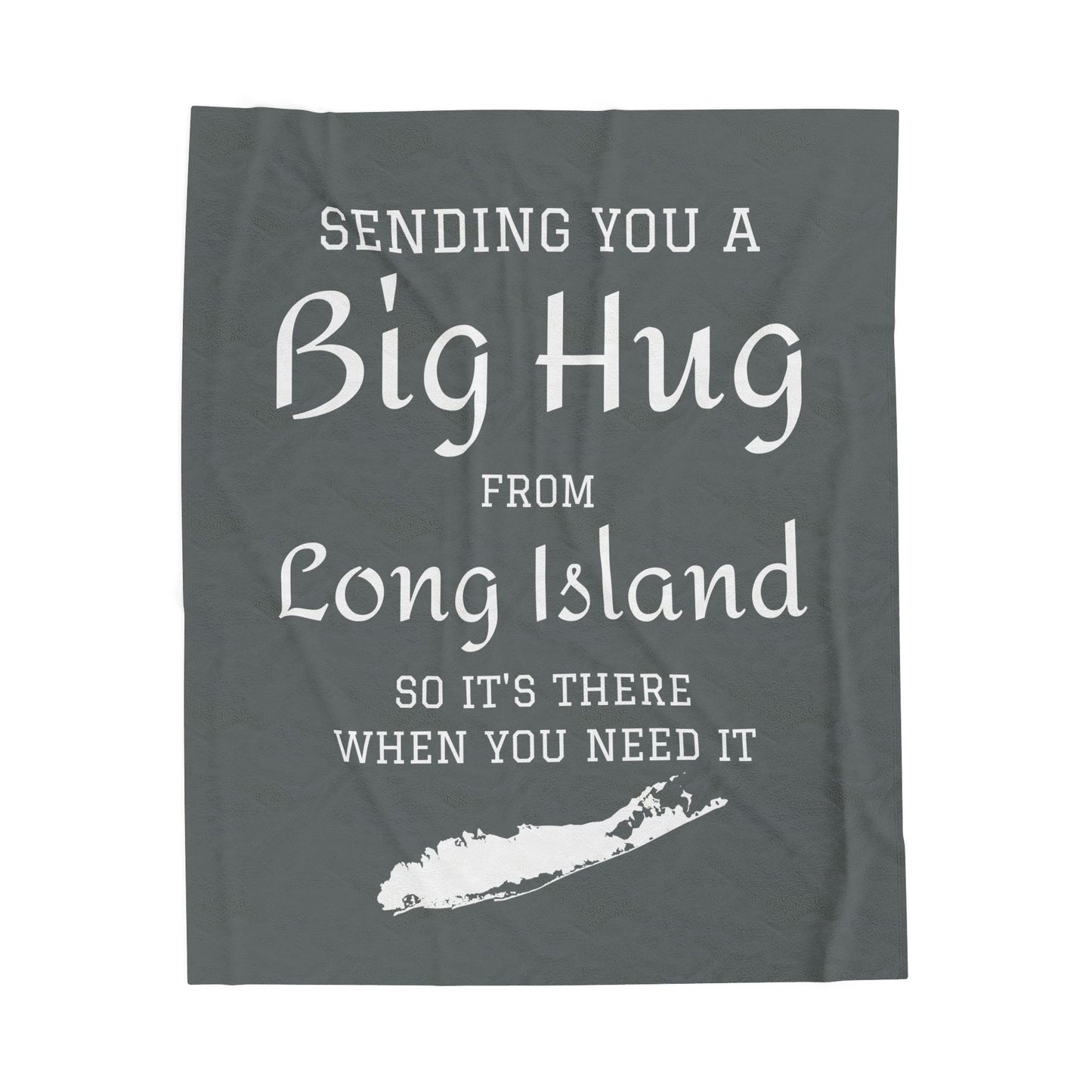 Wrap yourself or a loved one in comfort with this ultra-soft 50" x 60" velveteen plush blanket in a calming grey hue. Featuring the heartfelt message, "Sending You a Big Hug from Long Island So It's There When You Need It," along with a subtle outline of Long Island, this cozy throw is perfect for those far away or anyone needing a little extra warmth and love. Ideal for gifting or keeping close for those chilly evenings.