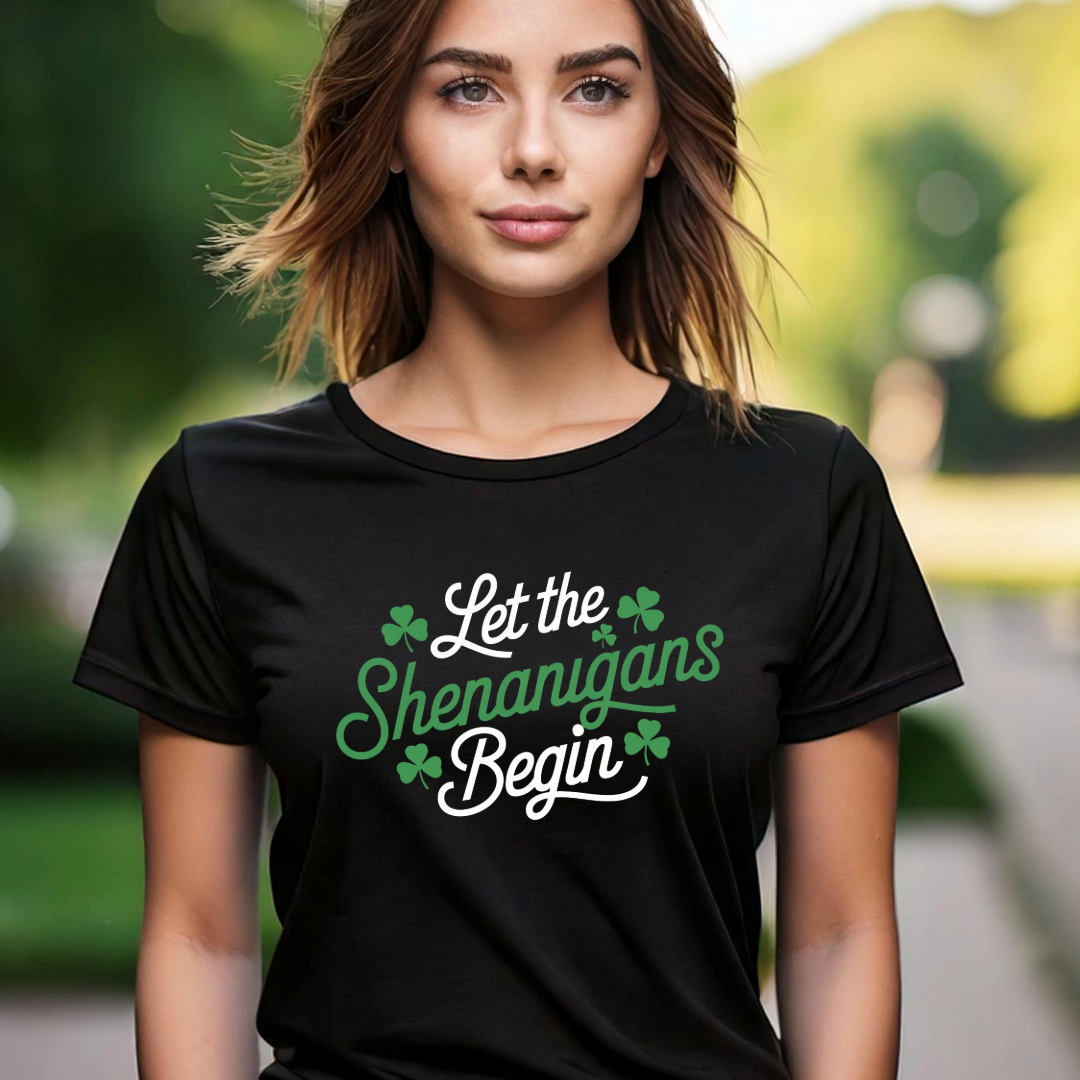 A fun and lighthearted T-Shirt featuring the words "Let the Shenanigans Begin" with a few shamrocks, perfect for St. Patrick's Day celebrations and anyone who enjoys a playful vibe in their wardrobe. Made with 100% Airlume combed and ring-spun cotton, this T-Shirt is lightweight and breathable, suitable for active and leisure wear. The retail fit and crew neckline make it versatile for casual and semi-formal settings.