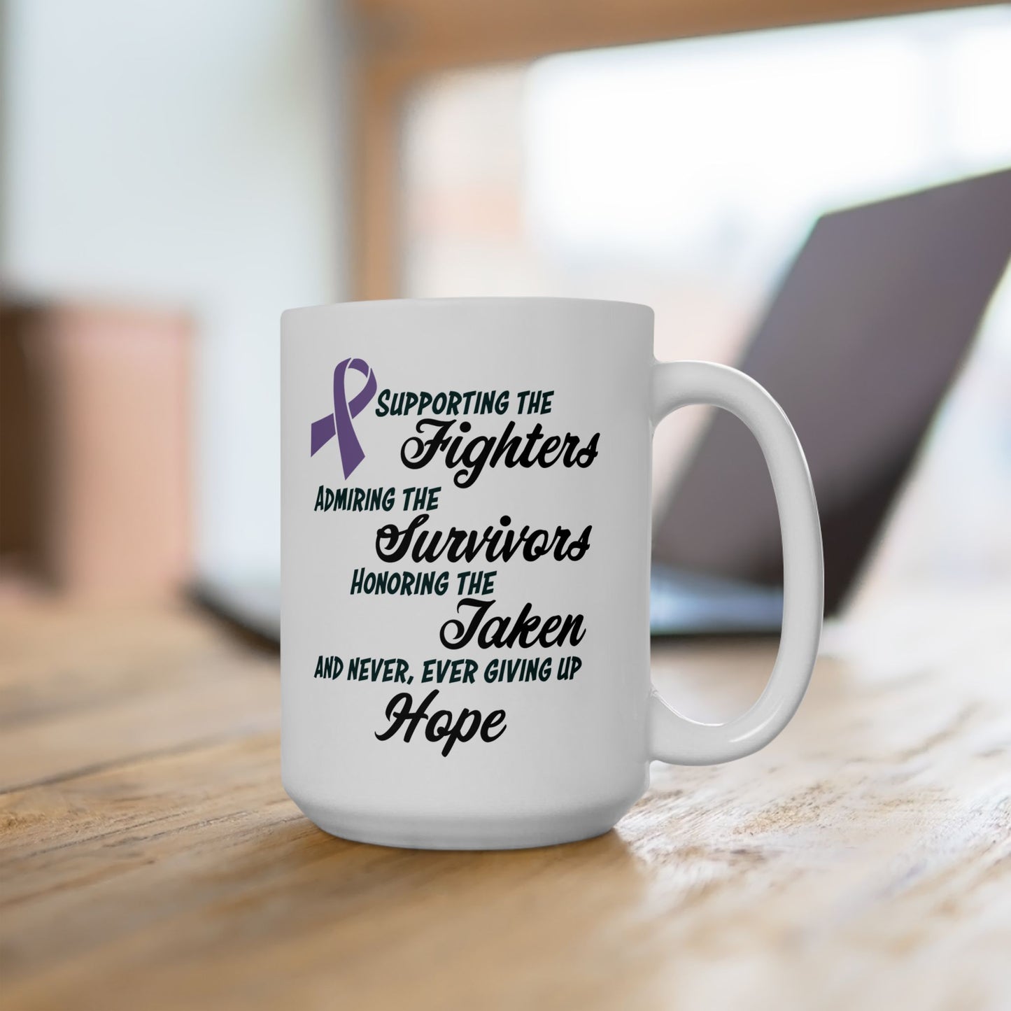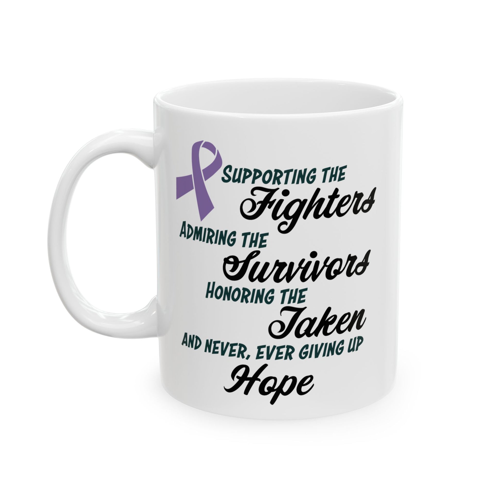 Show your strength and compassion with this white ceramic mug, featuring the heartfelt message: "Supporting the fighters, admiring the survivors, honoring the taken, and never, ever giving up hope." Accompanied by a lavender ribbon (Lavender ribbon design to represent support for all cancer types), this mug serves as a powerful symbol of support for those affected by all types of cancer.