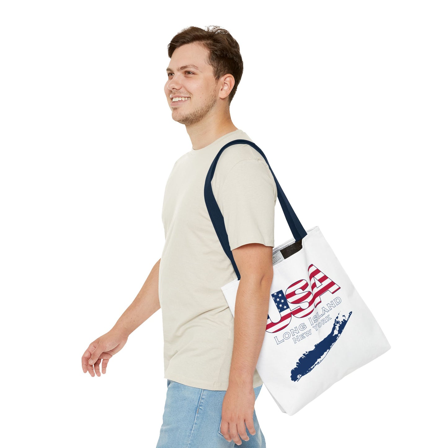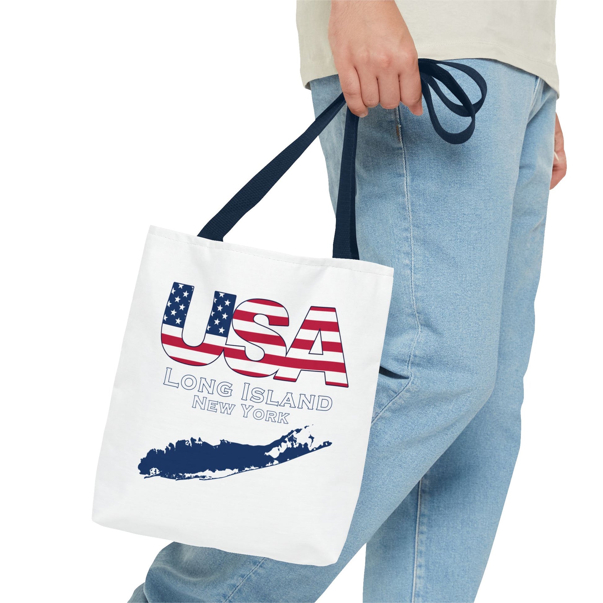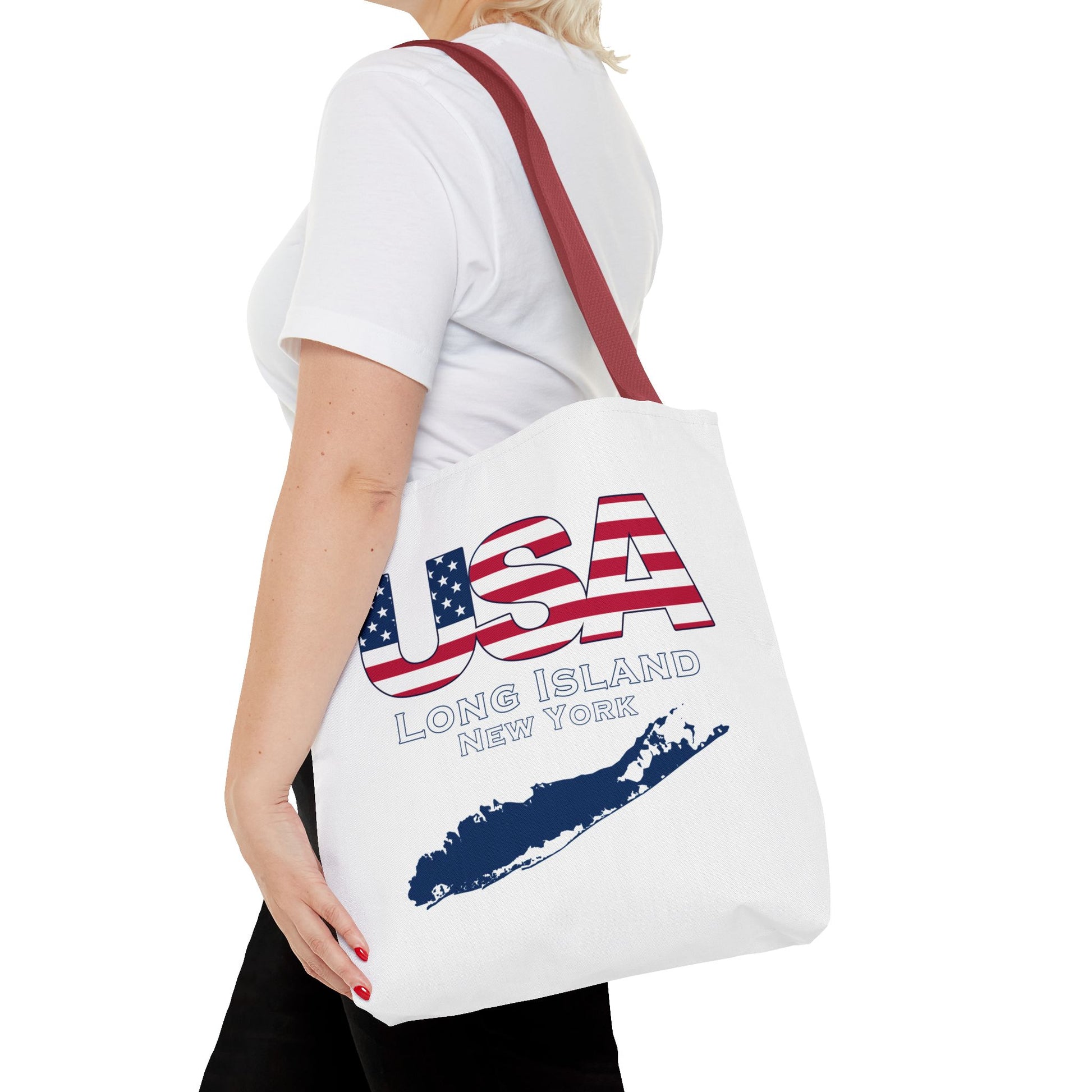 Introducing our stylish Tote Bag, the perfect accessory for anyone on the go. This eye-catching bag embodies a vibrant American spirit, ideal for showcasing your Long Island pride. Its spacious design makes it perfect for daily errands, beach trips, or weekend getaways. Whether you're a student, a busy parent, or a travel enthusiast, this tote will add a touch of personality to your routine. It's a fantastic gift for holidays like Independence Day, Memorial Day, or any summer celebrations, embodying a sense of adventure and exploration. Embrace your unique style and practicality with this versatile tote, ready for your everyday adventures!