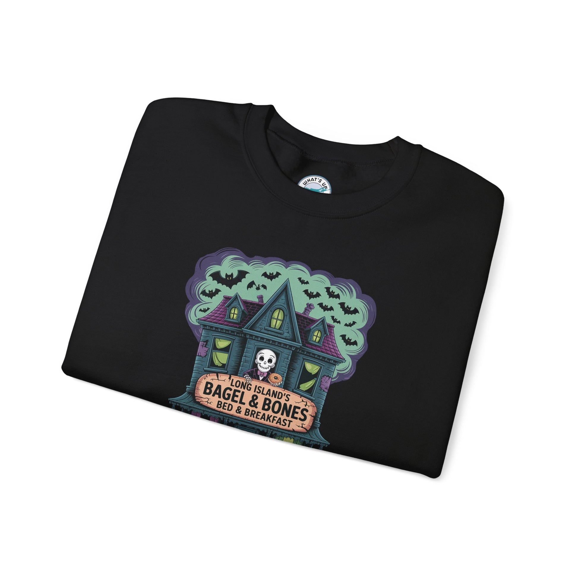 What's Up Long Island? Bagel and Bones Bed and Breakfast Spooky House Crewneck Sweatshirt - Perfect for Halloween, Unisex Sweatshirt