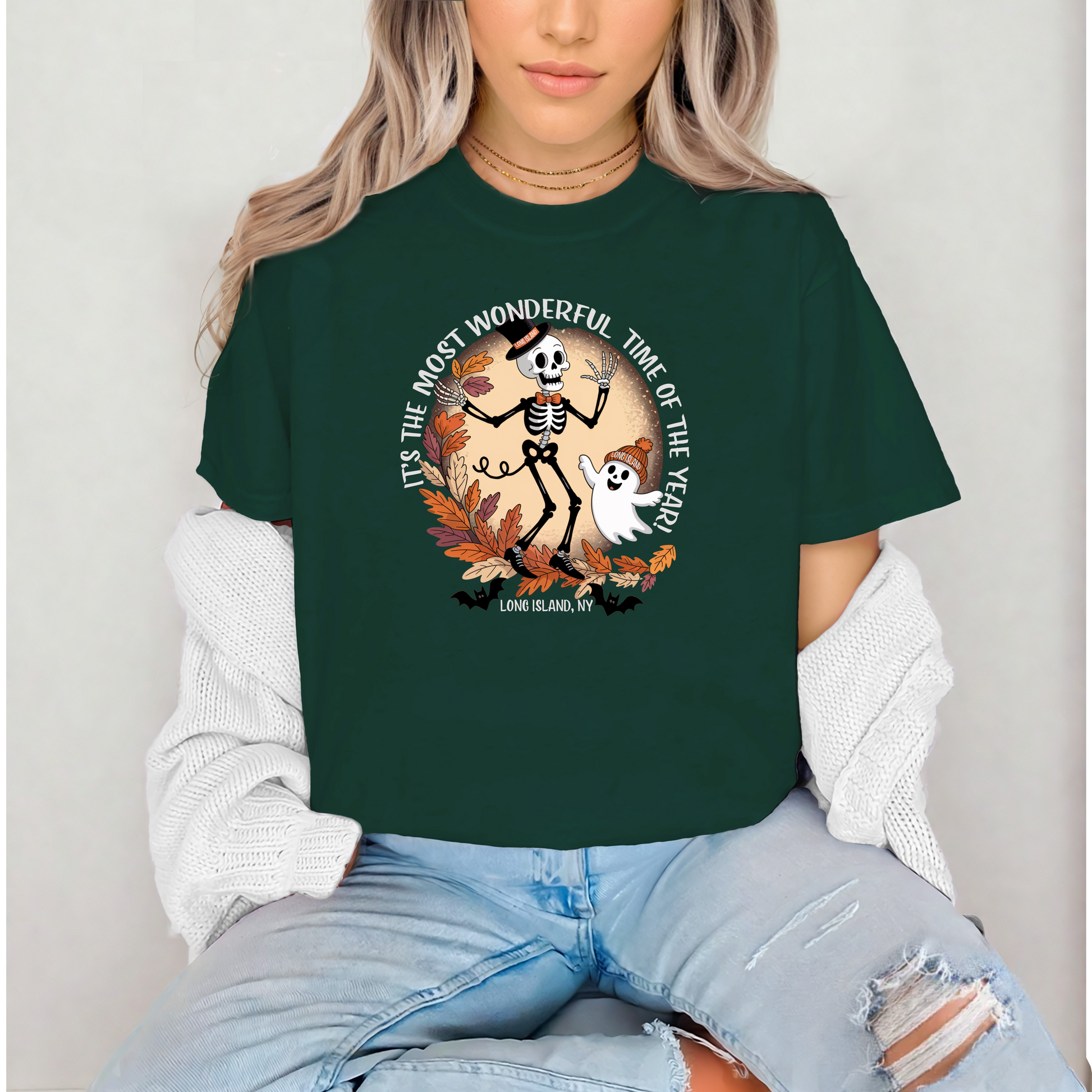 Embrace the festive spirit with our Long Island Halloween Skeleton & ghost T-Shirt. This classic unisex jersey short sleeve tee fits like a well-loved favorite. Featuring a playful skeleton wearing a top hat and a bow tie, accompanied by a cheerful ghost, this design is surrounded by autumn leaves and Halloween motifs. The visual appeal is enhanced by the humorous phrase embodying the joy of the season. Perfect for Halloween gatherings or casual outings.